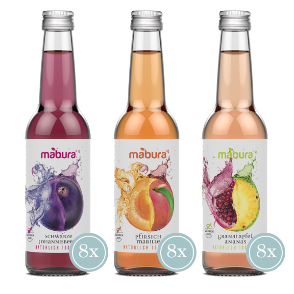 Pfirsich & Marille. Das sommerliche Duo überzeugt mit fruchtiger Süße. Die MABURA BIO-Fruchtgetränke werden mit hauseigenem Bergquellwasser hergestellt. Für besonders leichten Genuss verzichten wir gänzlich auf die Zugabe von Kristallzucker. Pfiffig im Geschmack und herrlich leicht mit nur 21 kcal pro 100ml.